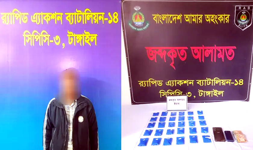প্রেসবিজ্ঞপ্তিতে জানানো হয়, সিপিসি-৩, র্যাব-১৪, টাঙ্গাইল ক্যাম্পের আভিযানিক দল। বুধবার, ১৪ জানুয়ারি বিকেলে গোপন সংবাদের ভিত্তিতে যমুনাসেতু-ঢাকা মহাসড়কের মির্জাপুর উপজেলার চরপাড়া মোড়ে পাকা রাস্তার উপর চেকপোস্ট স্থাপন করে। চেকপোস্টে গাড়ি তল্লাশিকালে আর কে পরিবহন যাত্রীবাহী বাস চেকপোস্ট অতিক্রম করার সময় সিগন্যাল দিয়ে যাত্রীবাহী বাসটি থামায়। উপস্থিত সাক্ষিদের সম্মুখে বাস হতে মাদক কারবারি মোঃ এনামুক হক (৫৫), থানা- সিংড়া, জেলা- নাটোরকে আটক করা হয়। তাকে জিজ্ঞাসাবাদ করলে অবৈধ মাদকদ্রব্য ইয়াবা থাকার কথা স্বীকার করে।